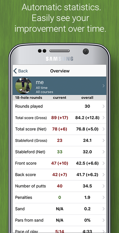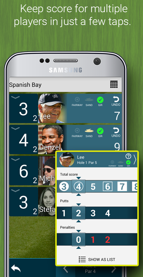 Kostenlose Scorecard in PGA-Qualität für 1-4 Golfer . Verfolge Schläge, Putts, Strafen, Sand und Fairways für jeden Spieler